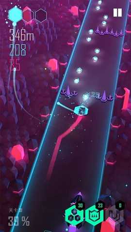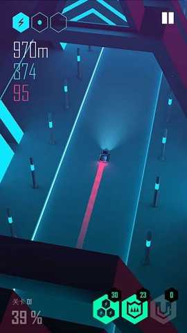 电音超跑作为一款竞速类音乐游戏,电音超跑的玩法还是相对比较的通俗易懂的,在这里你将成为一名孤独的驾驶者飞驰在被节奏操控着的凄寂冷漠的虚拟世界里,在这里你只需要通过左右滑动以实现左右侧的移动,上滑跳跃和下滑来操作赛车进行赛跑即可。
