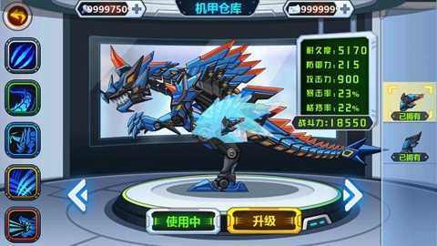 另外,玩家亦可在仓库中升级你的机甲,各式各样的机甲强化与升级,不仅能提升机甲的防御力、攻击力,而且对于战力的升级也是重中之重,随着高级的机甲装配,你可以通过王者战场来获取更高级的机甲装备。