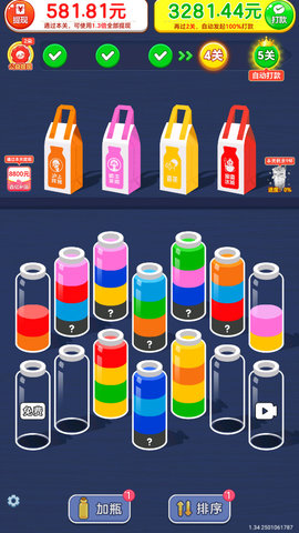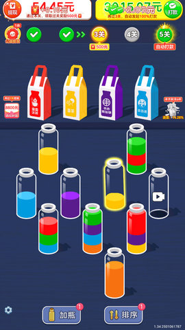 只要把相同颜色的水都倒进同一个瓶子,瓶子装满之后,就可以自动装进袋子,完成订单