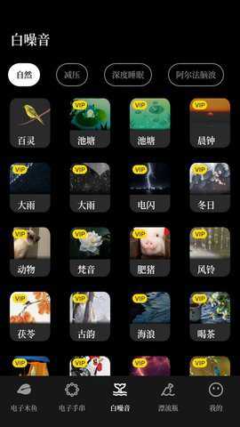 在白噪音功能里,你能够按照自身需求挑选自然、减压、深度睡眠、阿尔法脑波这类分类,来播放相应的环境音效。