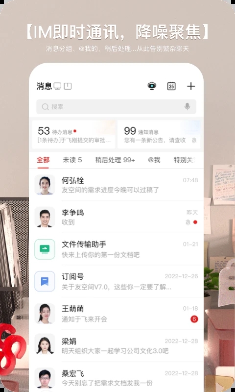 跨空间产品级应用,支持外部邮件收发,支持业务调用;主题沟通集中清晰,转任务、转日程更便捷。