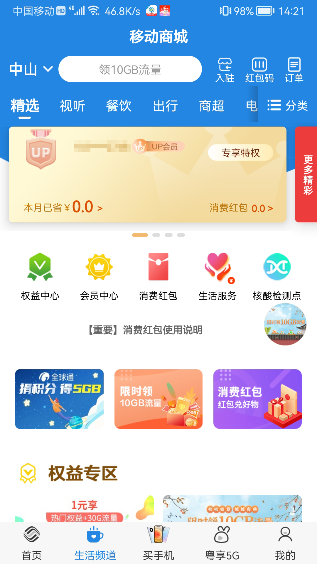 1、在本站下载打开广东移动智慧生活app,在首界面可以看到许多优惠福利:优惠卷、流量特惠、套餐等;