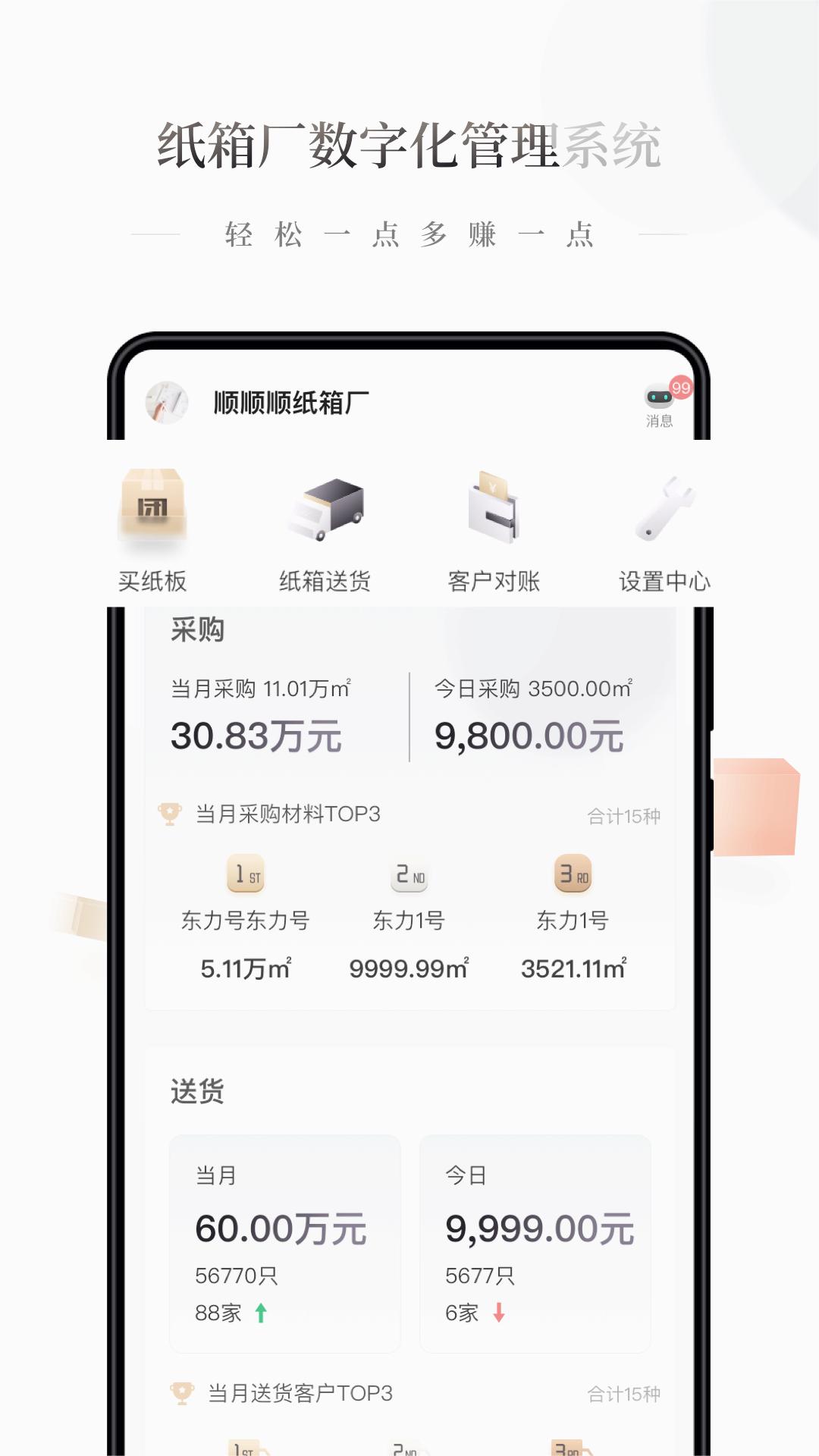 解决方案:易纸箱升级版小程序可实现采购统一管理、手机远程打印送货单、灵活快速对账、内外径一键转换、快速计算纸箱单价,让纸箱厂实时掌握工厂生产经营状况,管理更轻松。
